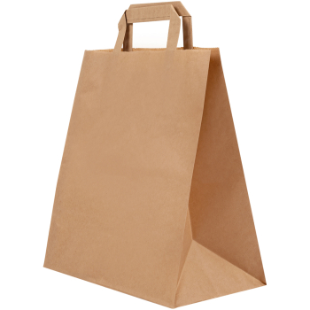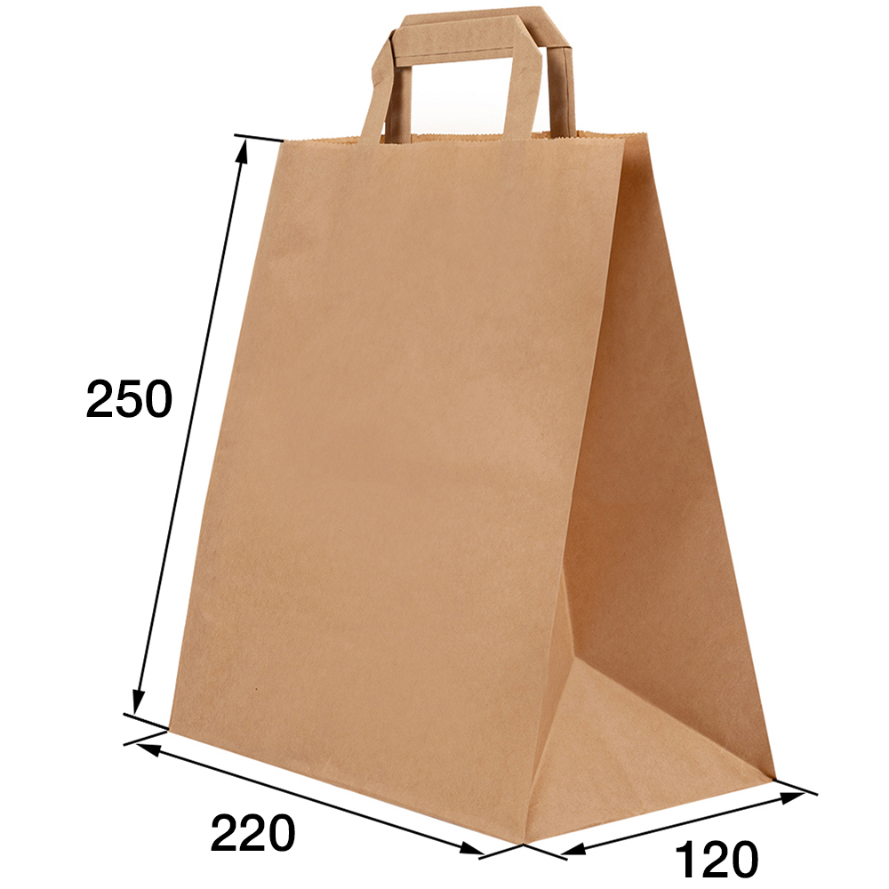 Бурый крафт-пакет с плоской ручкой длиной 220 мм, шириной 120 мм, высотой 250 мм, плотностью 70 г/м². Пакеты производятся в России.