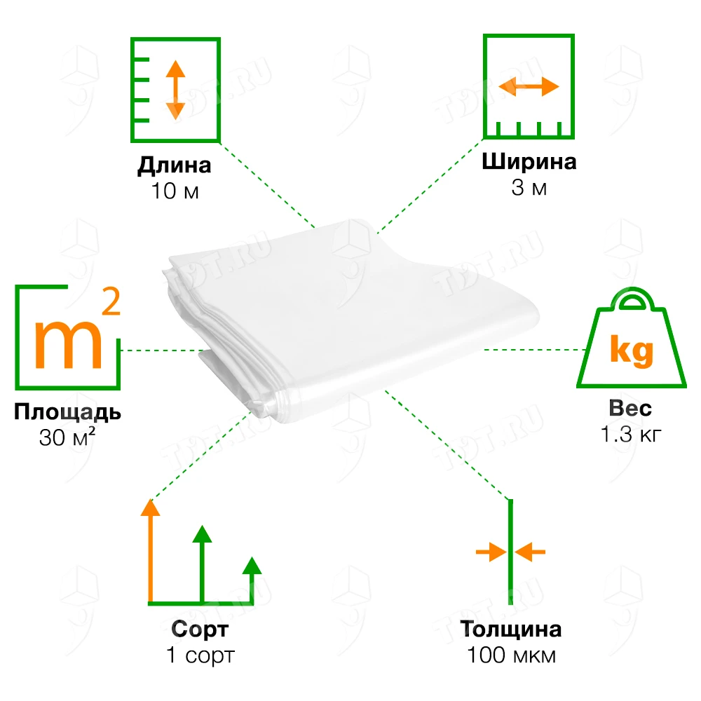 Прозрачная пленка ПВД (1 сорта) в рукаве, толщиной 100 мкм, шириной 1,5 м, длиной 10 м. При развороте и разрезе общий размер составит 3м*10м.