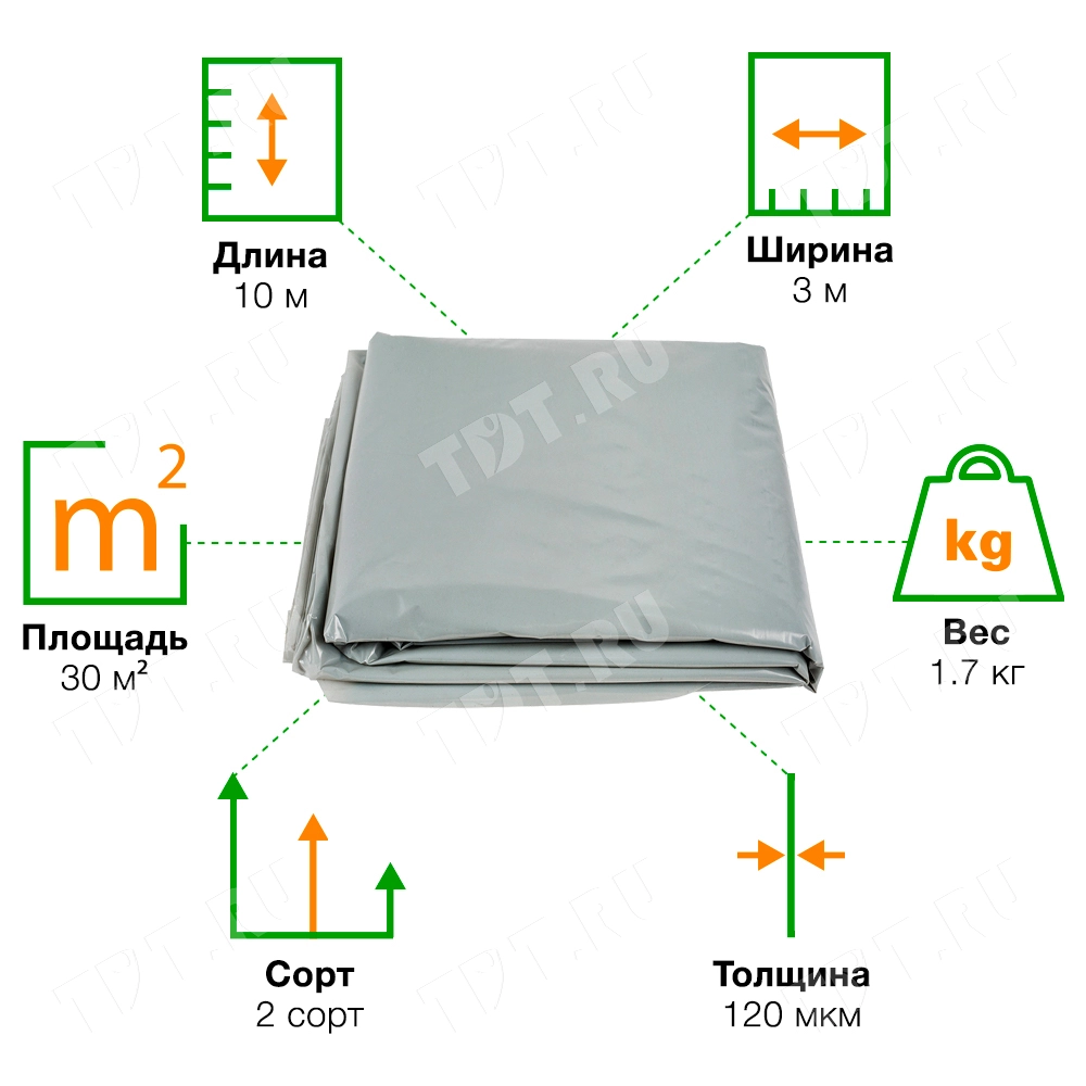 Серая полупрозрачная пленка ПВД (2 сорта) в рукаве, толщиной 120 мкм, шириной 1,5 м, длиной 10 м, при развороте и разрезе общий размер составит 3м*10м. Пленка производится в России.