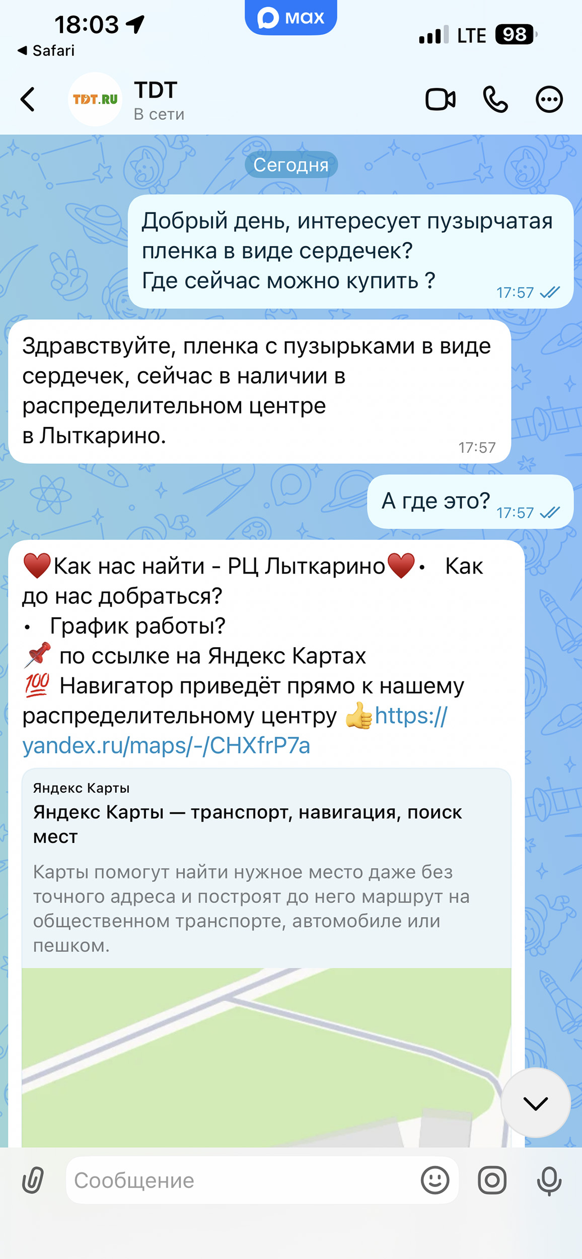 Мы всегда стремимся быть ближе к вам и делать всё, чтобы сотрудничество с нашим интернет-магазином упаковочных материалов было максимально комфортным. С подключением MAX мы сможем сократить задержки и неудобства нашей обратной связи.